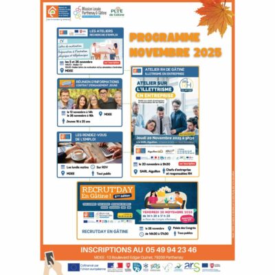 Retrouvez le programme de la Maison de l’Emploi et des Entreprises de Parthenay et de Gâtine du mois de novembre 2025. Ateliers recherches d’emploi (CV + Lettre de motivation) Réunion d’information CEJ Recrut’day en Gâtine Atelier RH de Gâtine : ... Lire plus