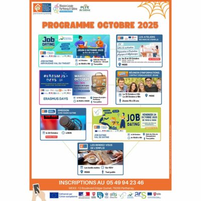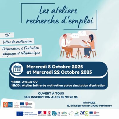 Retrouvez le programme de la Maison de l’Emploi et des Entreprises de Parthenay et de Gâtine du mois d’octobre 2025. Job Dating Airvaudais Val du Thouet Ateliers recherches d’emploi (CV + Lettre de motivation) Erasmus Days ! Réunion d’information CEJ ... Lire plus
