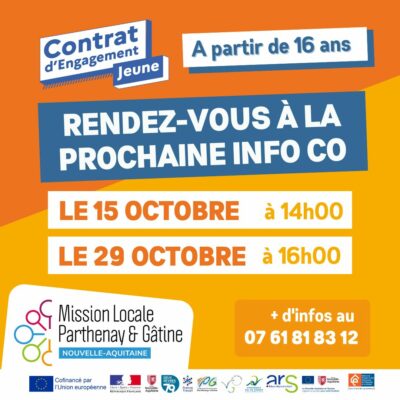 Le CEJ c’est : Un accompagnement personnalisé Des ateliers emploi, formation & sport, culture, santé Des aides au permis Une allocation chaque mois Rendez-vous à la prochaine info co CEJ ! Le Mercredi 15 Octobre à 14h. Le Mercredi 29 ... Lire plus