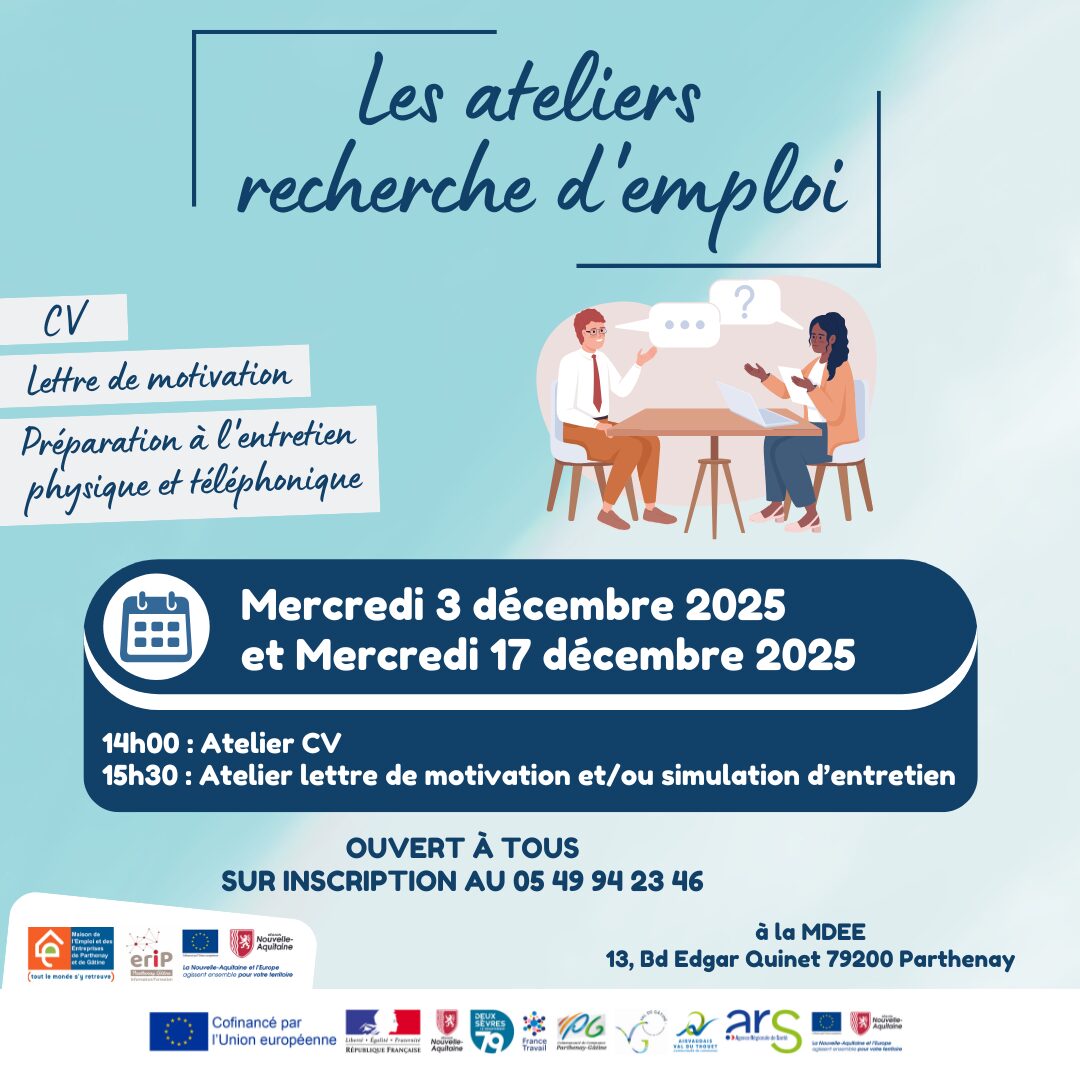 Actualités Ateliers recherche d’emploi Besoin d’aide pour votre CV? Lettre de motivation ? Préparation à l’entretien physique ou téléphonique ? Rendez-vous pour les ateliers recherche d’emploi ! Les Mercredi 3 Décembre et Mercredi 17 Décembre 2025. 14h00 : Atelier CV 15h30 : Atelier lettre de motivation et/ou simulation d’entretien Ouvert à tous, sur inscription au 05 49 94 23 46